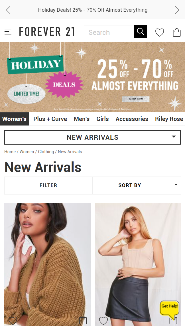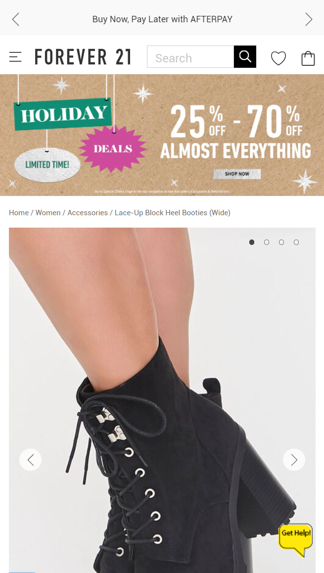 Forever21 è un esempio di cosa non si dovrebbe fare. Il loro ecommerce, in versione mobile, presenta molte opzioni di navigazione come breadcrumb o un unico pulsante indietro in una scheda orizzontale. La scheda prodotto presenta un’immagine enorme ed un banner in alto che distrae eccessivamente. È uno spreco di spazio. La navigazione crea spesso confusione e, per parte degli utenti, potrebbe risultare non così facile da usare, poiché si concentra più su “lookbook” e promozioni anziché indirizzare l’utente all’acquisto.