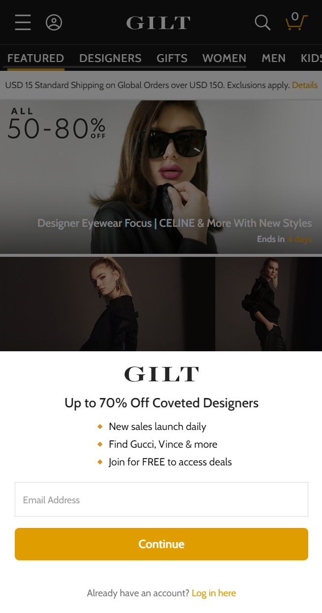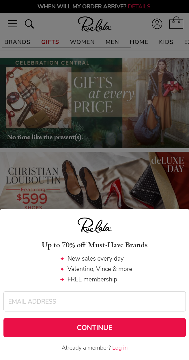 Rue Lala e Gilt sono solo due di alcuni esempi di ecommerce che non consentono ad un utente di accedere prima di essersi registrati o di aver fatto il login. Certo, è un po’ più facile superare questo “cancello” se hai già un account, ma non ha ancora senso chiederlo. Lo sappiamo, a molti sembrerà strana questa cosa ma credici, esistono ancora tanti ecommerce che adottano questa pratica che andrebbe assolutamente cambiata!