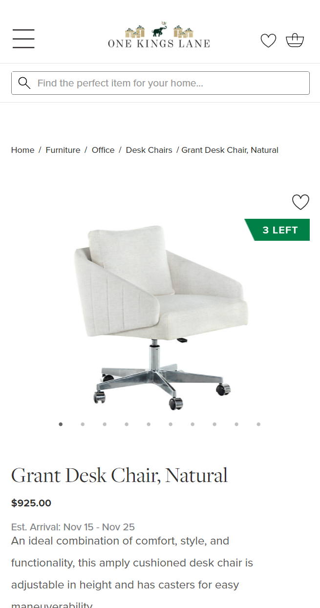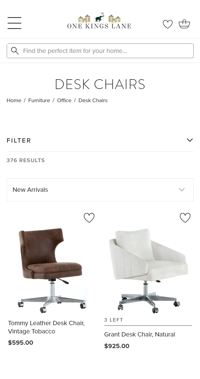 Ora dai un’occhiata a One Kings Lane. Quando apri per la prima volta il loro ecommerce, vieni accolto con grandi foto e un feed pieno di prodotti. La navigazione è così facile e così semplice perché l’interfaccia è priva di ingombri. La versione mobile di One Kings Lane consente all’utente di concentrarsi sullo shopping effettivo attraverso il suo design invitante. Insomma, vuoi solo guardare tutto quello che hanno!