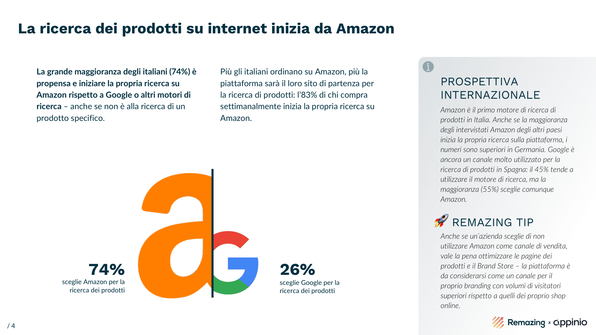 - Il 74% degli utenti Amazon che ha già ordinato sulla piattaforma di e-commerce inizia a cercare prodotti di tutte le categorie su Amazon piuttosto che su Google o altri motori di ricerca