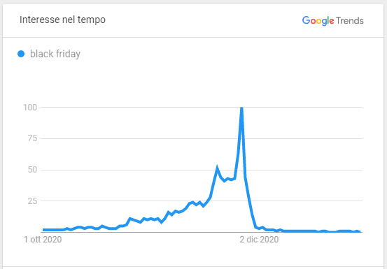 Capirai da subito che si tratta di un’occasione che va assolutamente sfruttata. Di seguito, un grafico di Google Trends che mostra i picchi di interesse degli ultimi 5 anni per la ricerca della parola “Black Friday” in Italia.