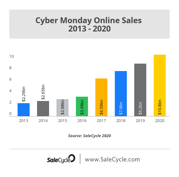 SaleCycle ci viene in soccorso con dei grafici interessanti che evidenziano i trend in costante crescita in termini di volumi di vendite durante il Black Friday e il Cyber Monday. Noterai che a partire dal 2013, la crescita è costante e non si fermerà di certo nel breve periodo.