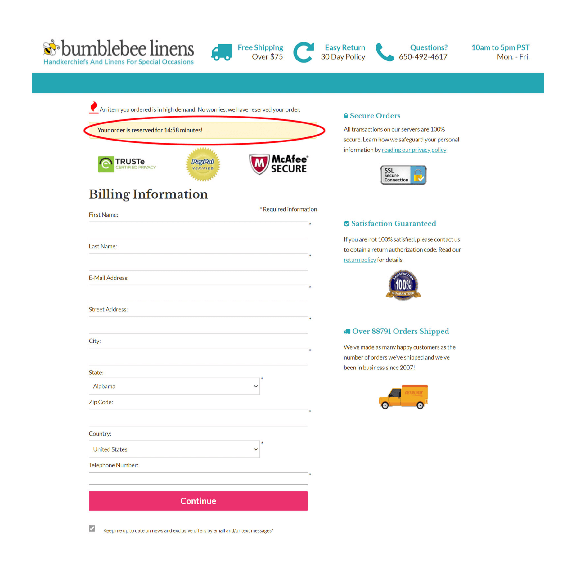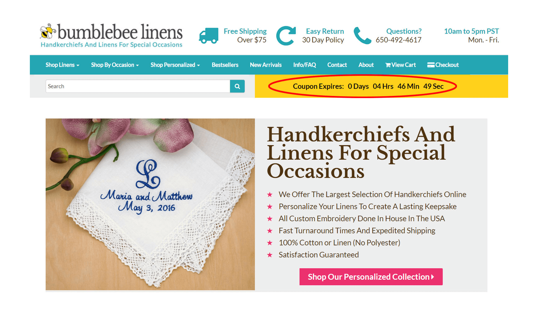 Alla maggior parte dei clienti piace guardare le vetrine e il modo migliore per convincere un visitatore ad agire è creare un senso di urgenza. Ogni volta che su Bumblebee Linens si sta per eseguire una vendita, viene visualizzato un grande timer giallo per il conto alla rovescia su ogni pagina del sito web.