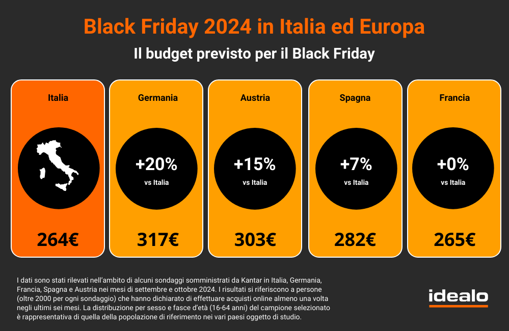 Se i nostri connazionali attendono con entusiasmo l’arrivo del Black Friday, anche negli altri paesi si respira aria di trepidante attesa. In particolare, i dati resi noti da idealo, evidenziano interessanti analogie e differenze a livello europeo quando si parla di budget: in cima alla classifica si posiziona la Germania, dove quest’anno la spesa media stimata si aggirerà intorno ai 317 euro, seguita da Austria (303 euro) e Spagna (282 euro). A parimerito con l’Italia (264 euro) invece la Francia, il cui budget resta intorno ai 265 euro.