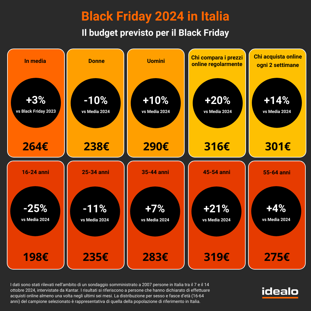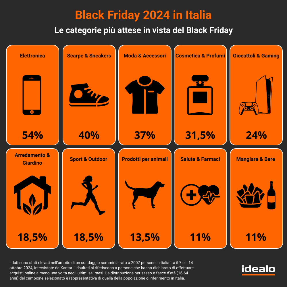 Manca poco a venerdì 29 novembre, il giorno da segnare sul calendario che quest’anno coinciderà con il più celebre degli appuntamenti per gli appassionati dello shopping e non solo: una ricorrenza annuale attesa ormai con grande entusiasmo in tutto il mondo, che sia per fare acquisti vantaggiosi, confrontare offerte o prepararsi per i regali di Natale. Non fa eccezione l’Italia, come confermano i dati dell’indagine a tema Black Friday commissionata da idealo – portale internazionale leader nella comparazione prezzi – all’istituto Kantar per analizzare e approfondire percezioni, attitudini e dinamiche di acquisto degli italiani in occasione del grande evento.