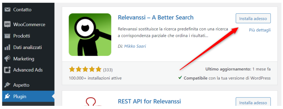 Puoi risolvere il tutto con un apposito plugin, che andrai a scaricare dalla sezione dedicata che trovi sulla sinistra nel pannello di amministrazione del CMS. Scrivi nella barra di ricerca dei plugin la parola Relevanssi, dopodiché clicca sul pulsante Installa adesso nella scheda di riferimento.