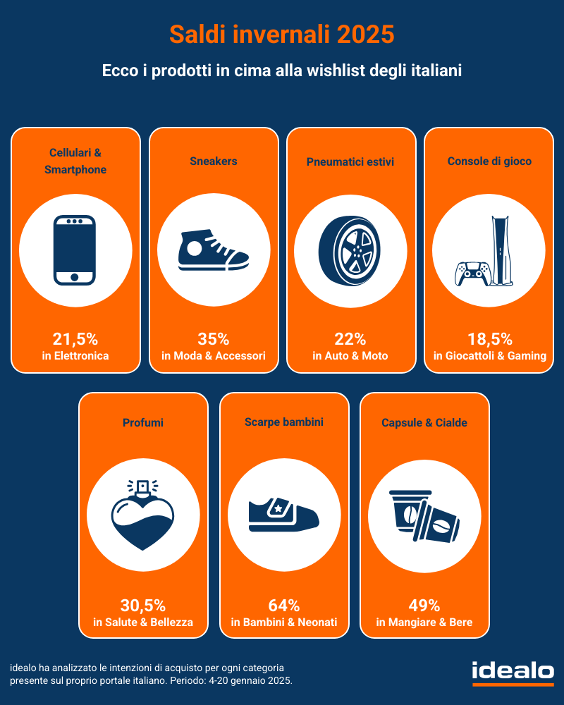 Con l’inizio dell’anno, i saldi invernali rappresentano un’occasione imperdibile per i consumatori italiani, che approfittano delle offerte per acquistare prodotti di necessità e concedersi qualche sfizio. Secondo l’Ufficio Studi Confcommercio, il giro d’affari dei saldi invernali 2025 ammonta a 4,9 miliardi di euro, con 16 milioni di famiglie coinvolte. Ma quali sono le categorie più ricercate online? Il portale di comparazione prezzi idealo ha analizzato le intenzioni di acquisto tra il 4 e il 20 gennaio 2025, rivelando i trend principali del periodo. Dai dati emerge un andamento comune tra tutte le macro-categorie, con alcuni prodotti che si distinguono per il forte interesse dei consumatori.