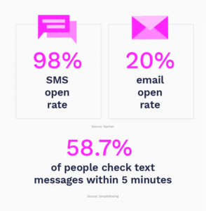 Gli sms vengono letti dal 98% delle persone, al contrario delle email che registrano un open rate medio del 20%. Tale risultato è spiegabile dalla ricerca svolta da SimpleTexing secondo la quale controlliamo il nostro smartphone in media ogni 5 minuti. Inoltre, il 68% delle persone dichiara che controllare, inviare e rispondere ai messaggi è l’attività principale che svolge durante il giorno, seguita da: controllare i social, controllare le email, effettuare chiamate e leggere notizie. Quindi, gli SMS non solo vengono letti rapidamente, ma difficilmente vengono cestinati o ignorati.