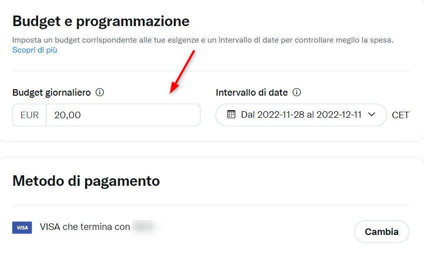 L’ultimo tassello, non ultimo in termini di importanza, è la definizione del budget e della durata della campagna. Ovviamente più riesci a investire, maggiori saranno le possibilità di raggiungere il maggior numero di potenziali clienti (è il caso di usare l’elegante espressione ça van sans dire). Imposta il budget giornaliero che intendi spendere, la durata della campagna e scegli il metodo di pagamento per pagare il dovuto a Twitter per la sponsorizzazione del post.