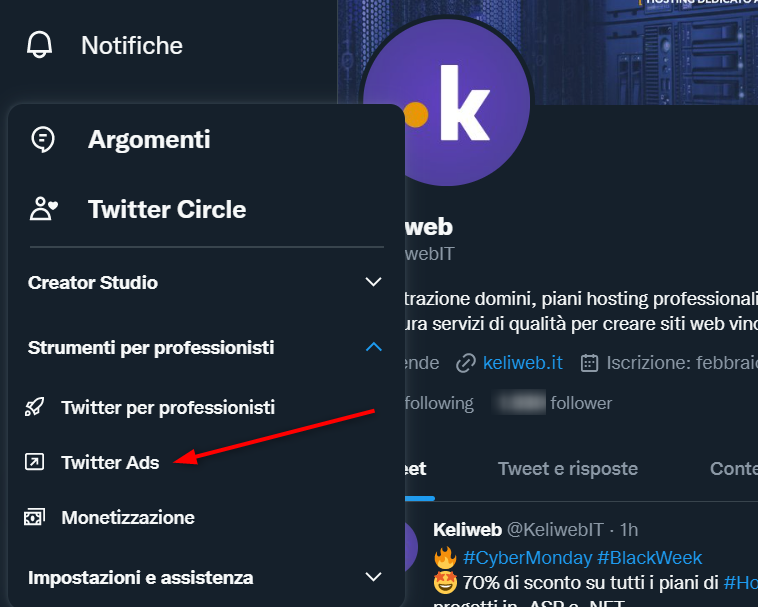 Qui si aprirà un menù a tendina, con tutte le varie funzionalità che ti permetteranno di gestire in maniera professionale il tuo account. Per creare una campagna pubblicitaria, clicca sulla voce Twitter Ads.