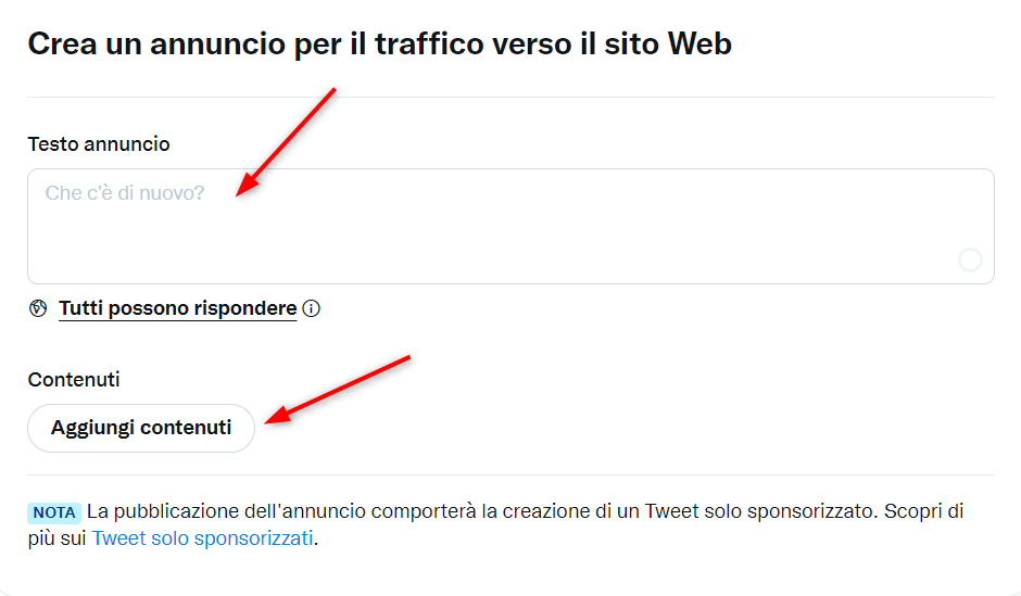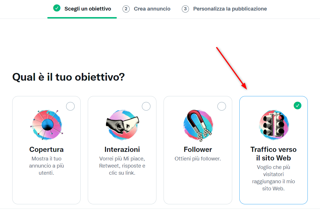 Quando crei una campagna, che sia su un social come Twitter, Facebook, Instagram e altri o su Google Ads, la cosa più importante è definire con precisione l’obiettivo. Perché stai creando una campagna pubblicitaria? Nel caso di un e-commerce, visto che Twitter non permette di selezionare una voce volta alla conversione, la scelta giusta è quella di selezionare Traffico verso il sito web, in modo tale da portare sul tuo negozio online persone che possono avere un interesse verso i prodotti presenti nella vetrina (quindi potenziali clienti).
