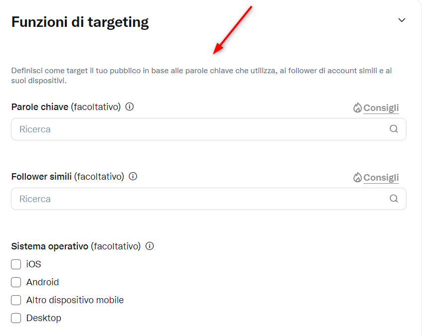 Il primo, le parole chiave che gli utenti che vogliamo raggiungere usano su Twitter.