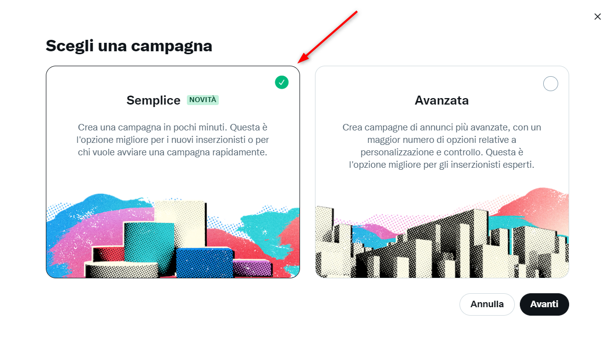 Twitter ti propone due diverse tipologie di campagne pubblicitarie. Visto che stai creando la tua prima campagna, ti consiglio di optare per una campagna semplice. Dopo che avrai fatto un po’ di pratica, potrai valutare la possibilità di creare campagne avanzate (con diverse funzionalità aggiuntive). Clicca quindi sulla voce Semplice e poi sul pulsante Avanti.